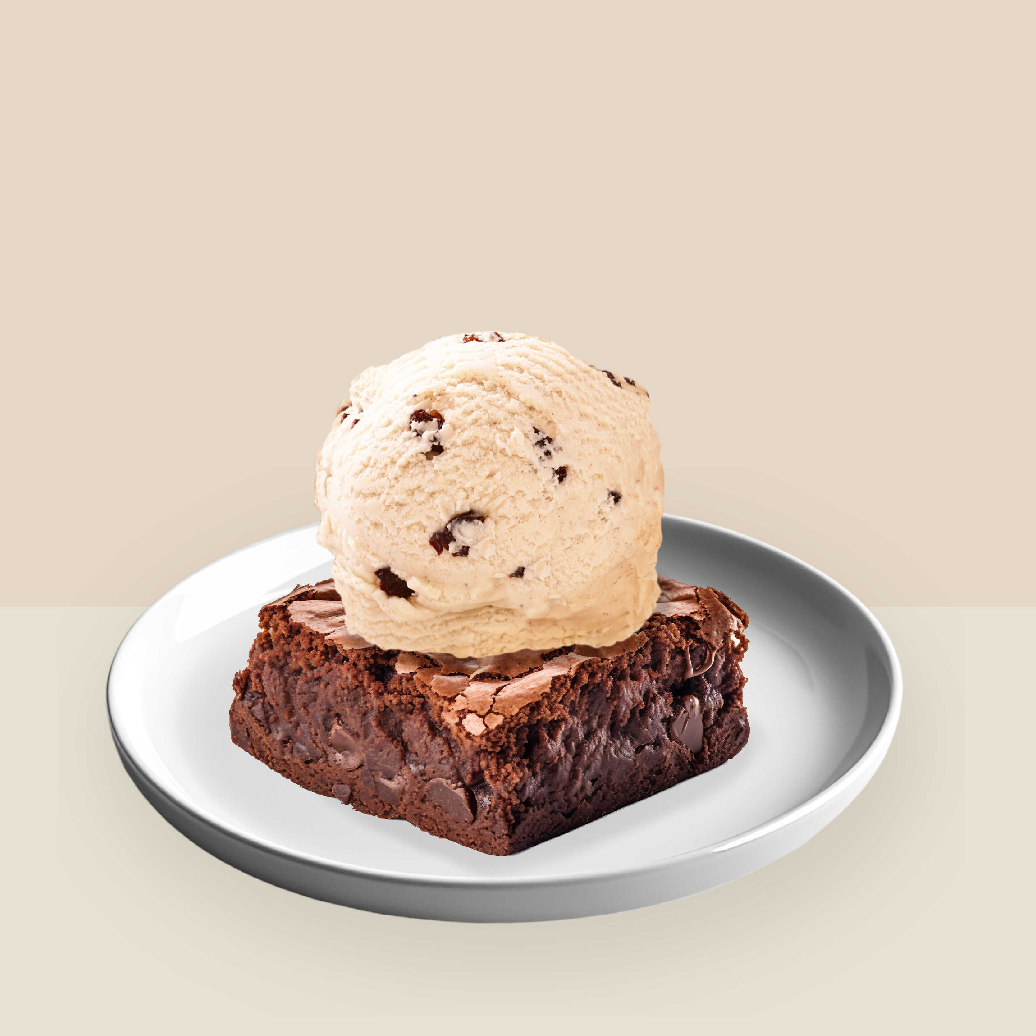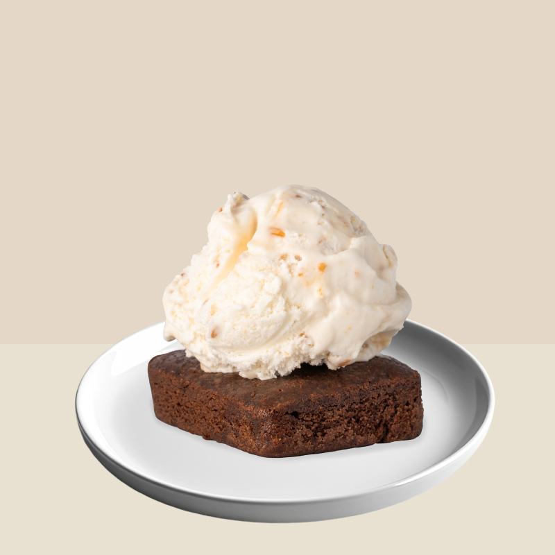 Brownie con helado sabor Yogurt con maní y caramelo salado