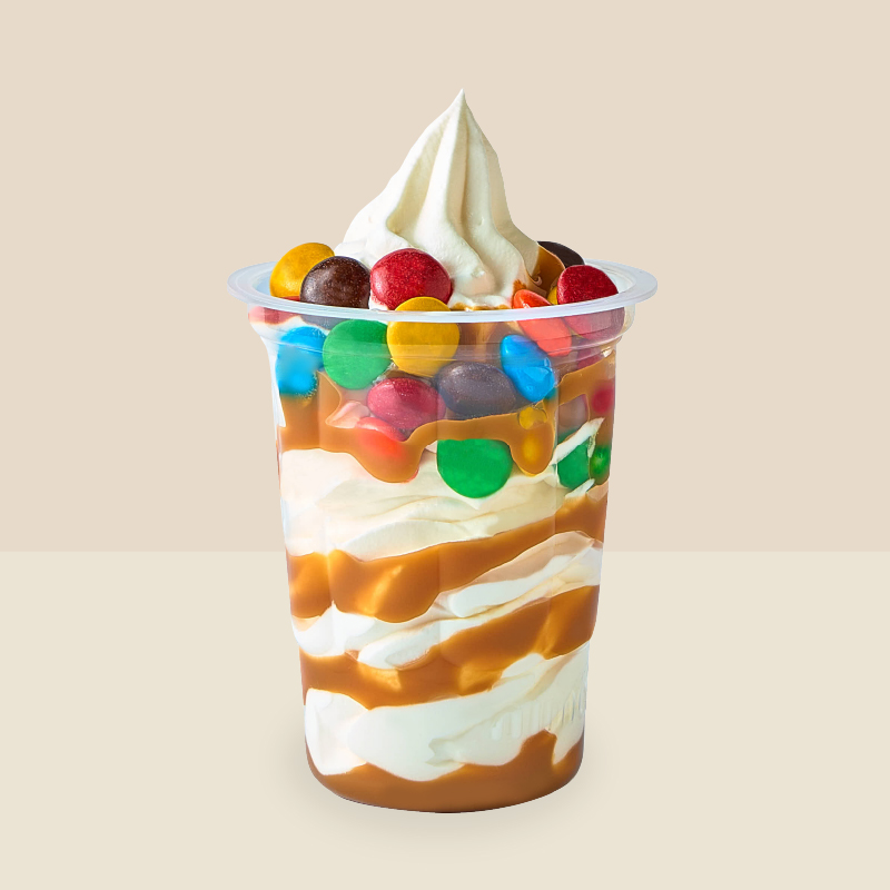 Divertida combinacion de Helado suave de vainilla, m&m y salsa Caramelo, imagen de referencia