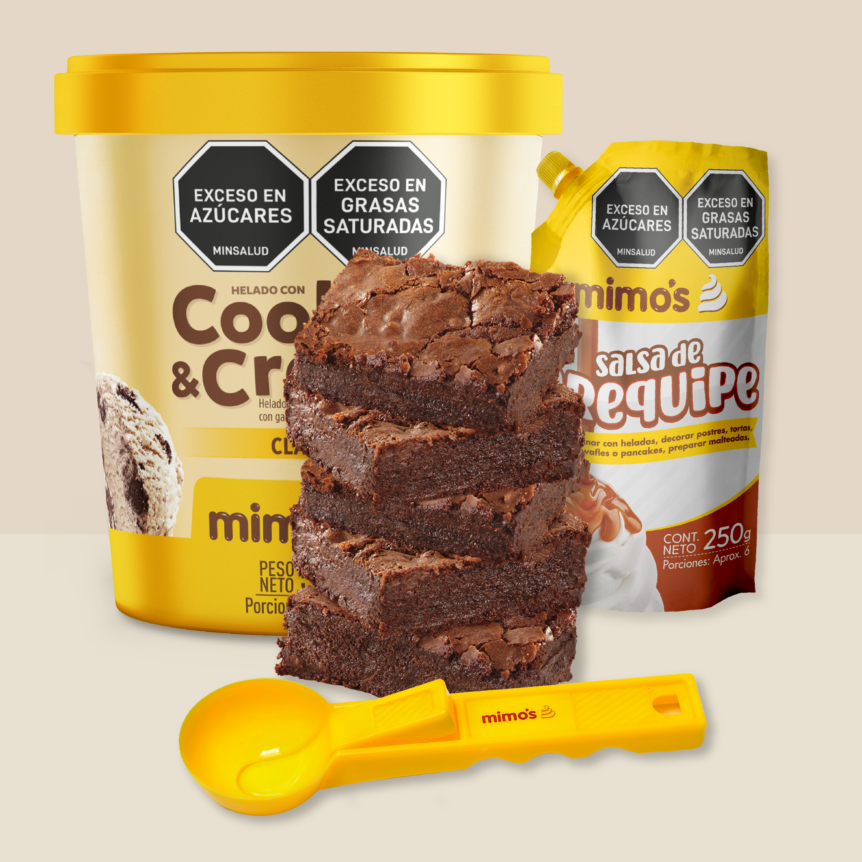 Elige tu litro y salsa favorita, con 5 brownies. Además, lleva una cuchara mimos.