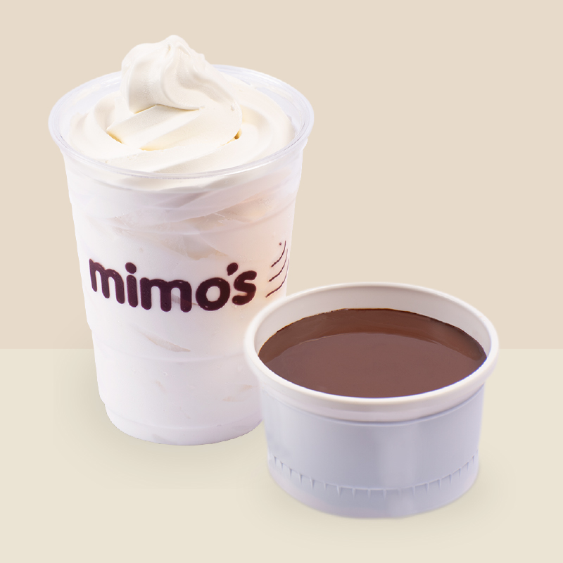 Perfecta combinacion de helado suave de vainilla y salsa de Chocolate Caliente, la consistencia de la cobertura de chocolate mimo's(caliente)puede variar a temperatura ambiente.
