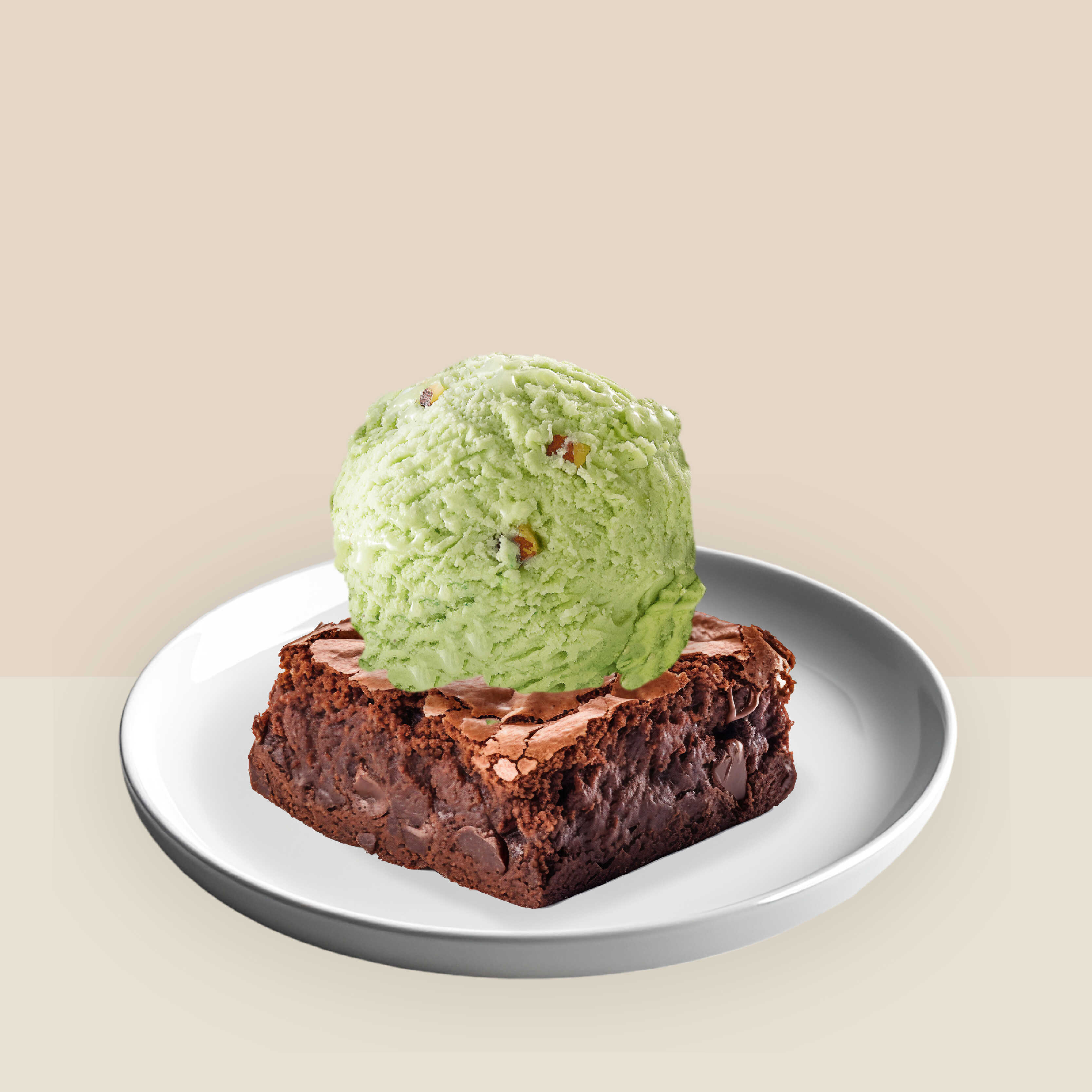 Brownie con helado sabor Yogurt con maní y caramelo salado