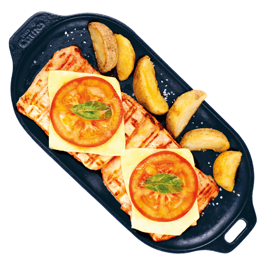 Lomo de Cerdo a la Parrilla Gratinado con rodajas de tomate y papas en casco