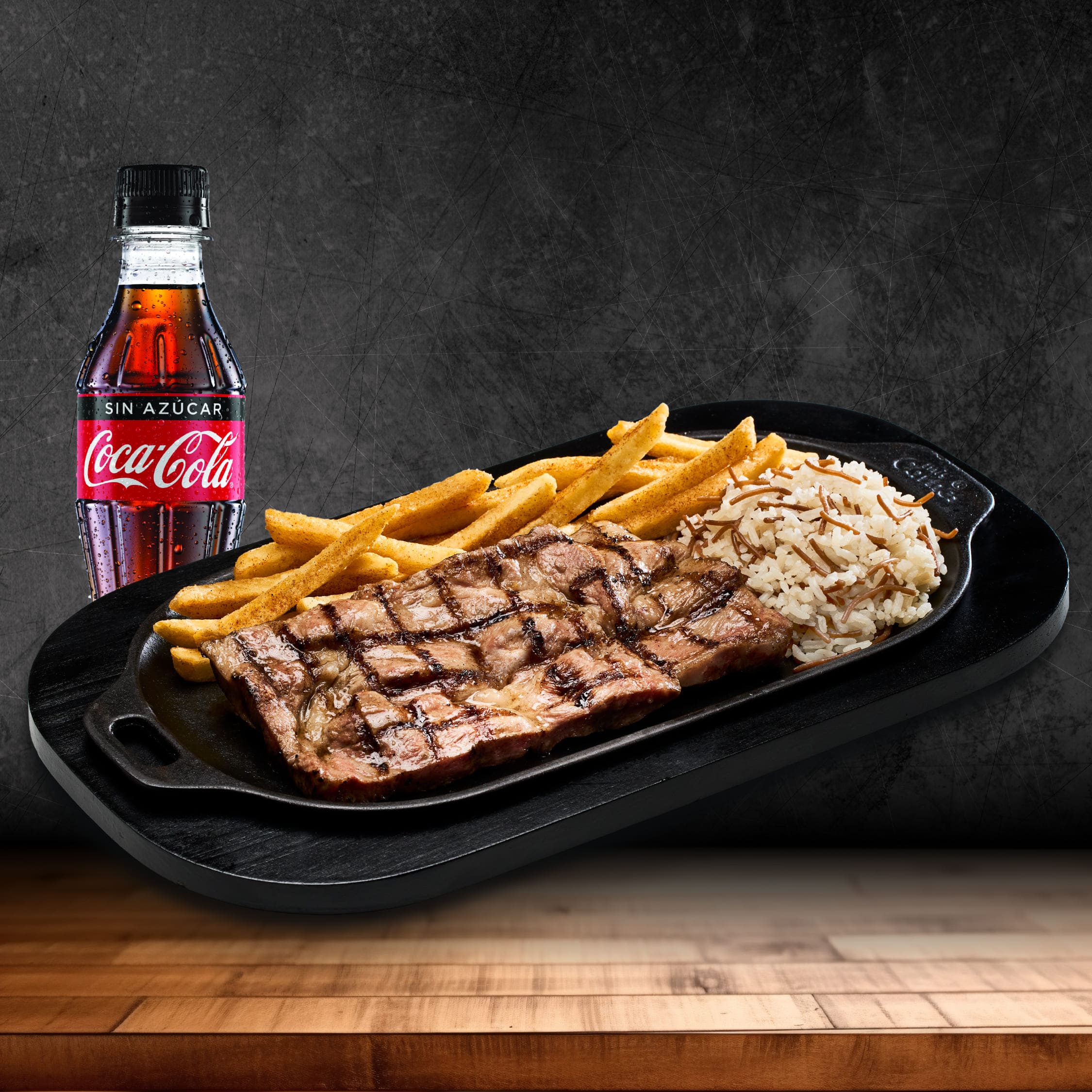 Deliciosa carne de res a la parrilla acompañada con papa francesa + bebida