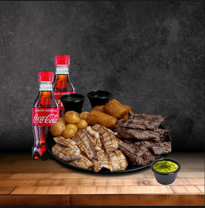 Carne de res, pechuga a la parrilla, costilla bbq, chicharrón, chorizo, morcilla, arepa de queso, plátano y papa criolla; con 2 coca cola 400ml.