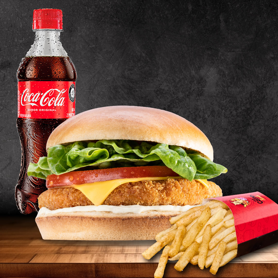 Hamburguesa de pollo apanado, con tomate, lechuga, queso cheddar con papas y coca cola original 400ml.