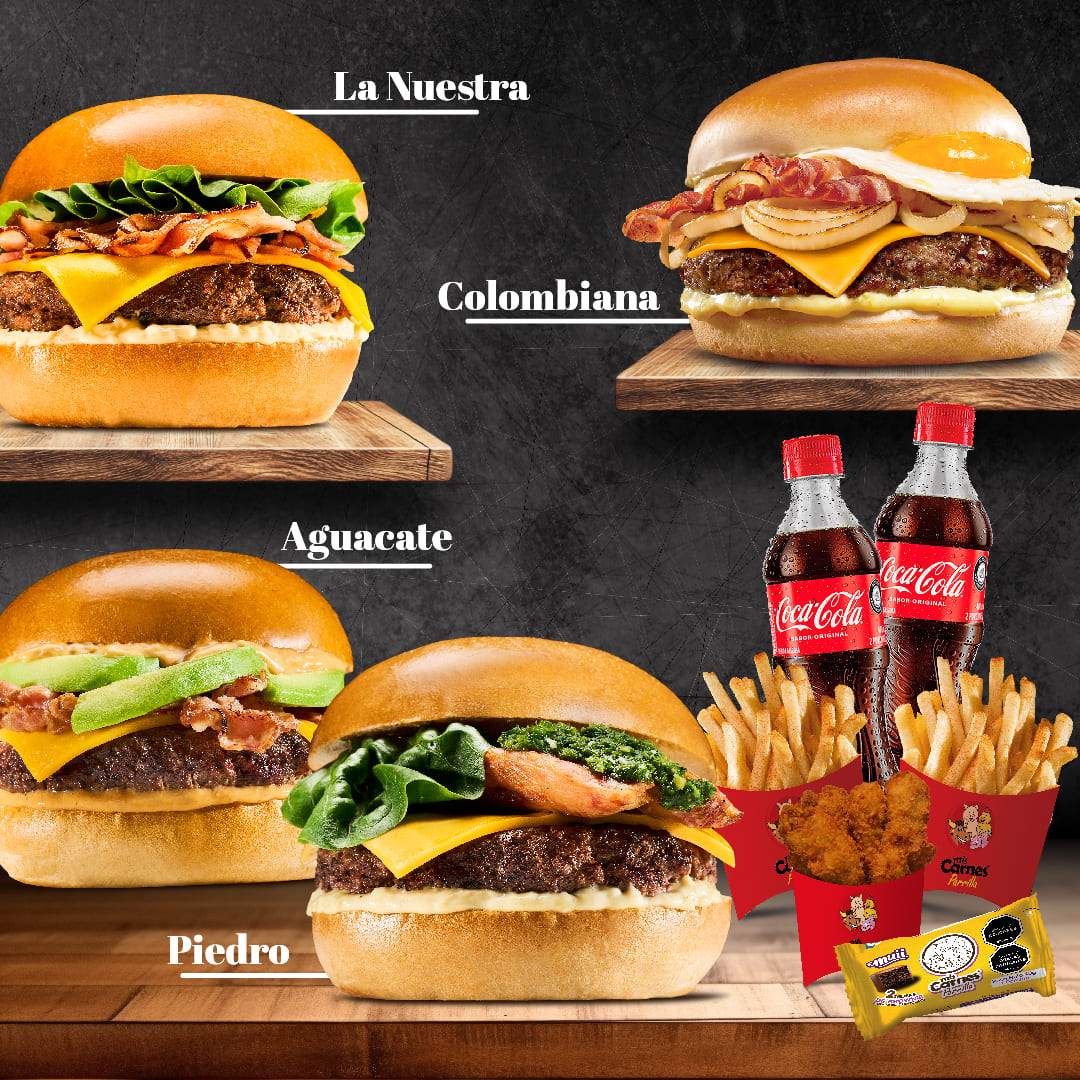 Elige 2 deliciosas hamburguesas de 130 gramos ( H. aguacate, H. la nuestra, H. colombiana y H. piedro) acompañadas de 2 porciones de papas, 2 bebidas, 6 tender de pollo y 1 paquete de trufas