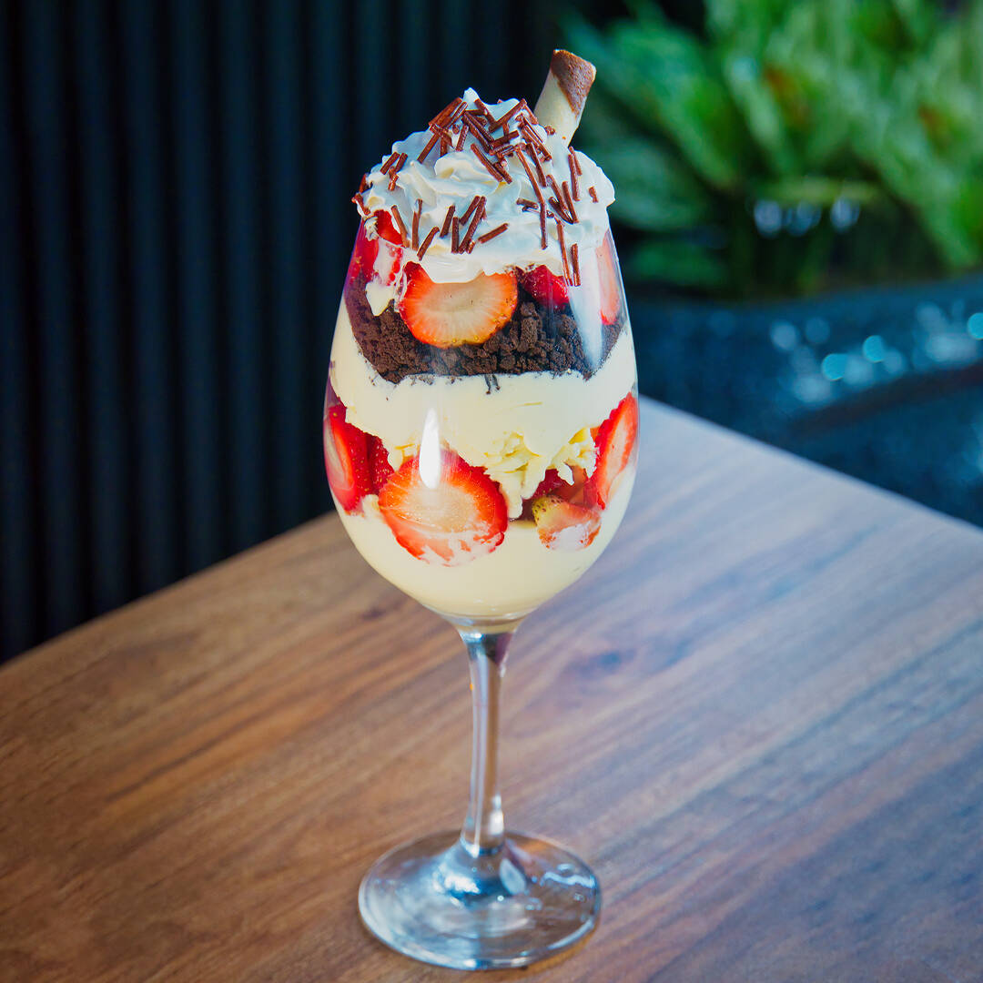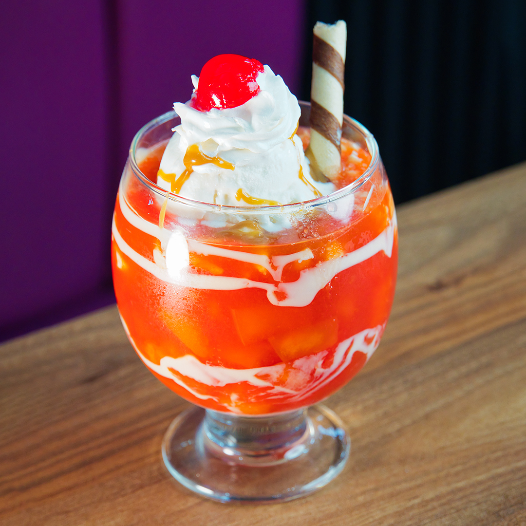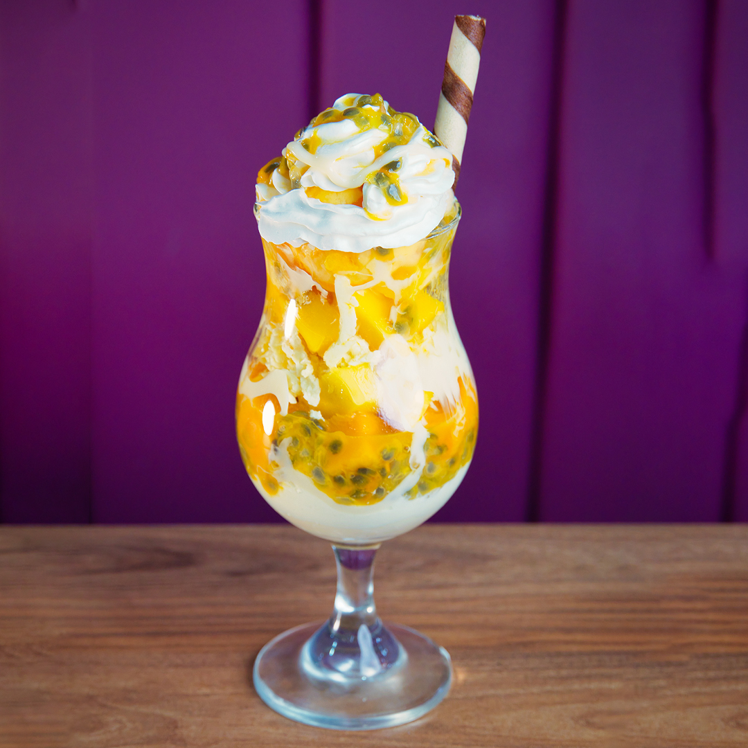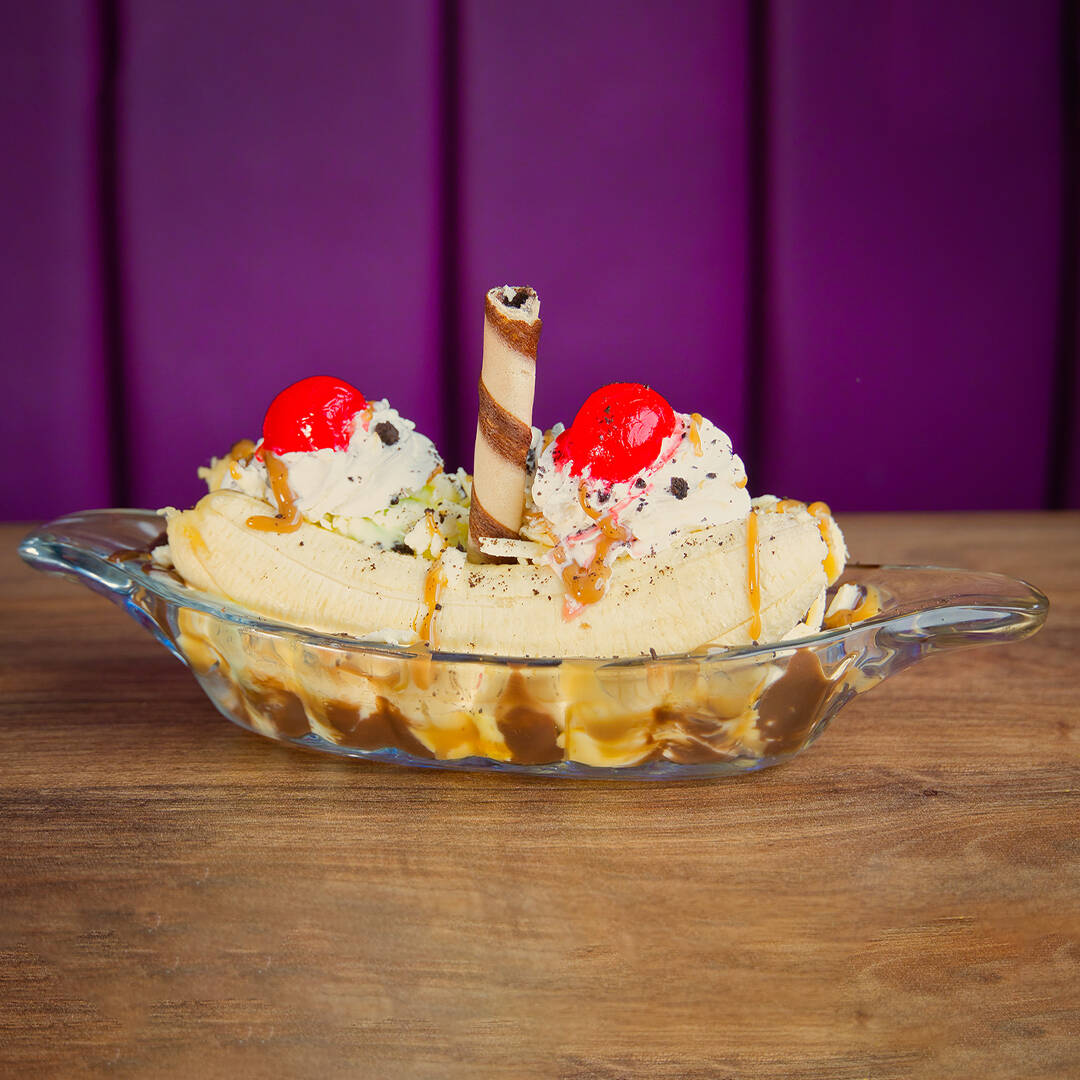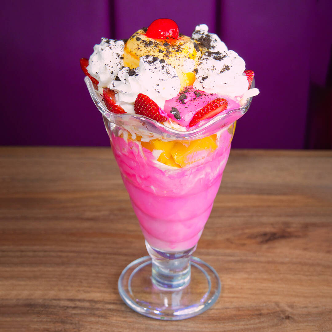 Papaya, mango, fresa, banano, 1 sabor de helado, crema, salsas.