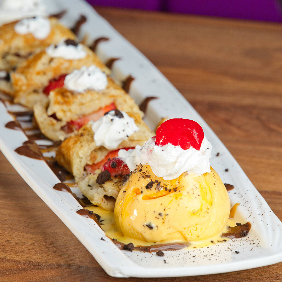 Crepes rellenos de 1 fruta (fresa o banano), queso, helado y salsas.