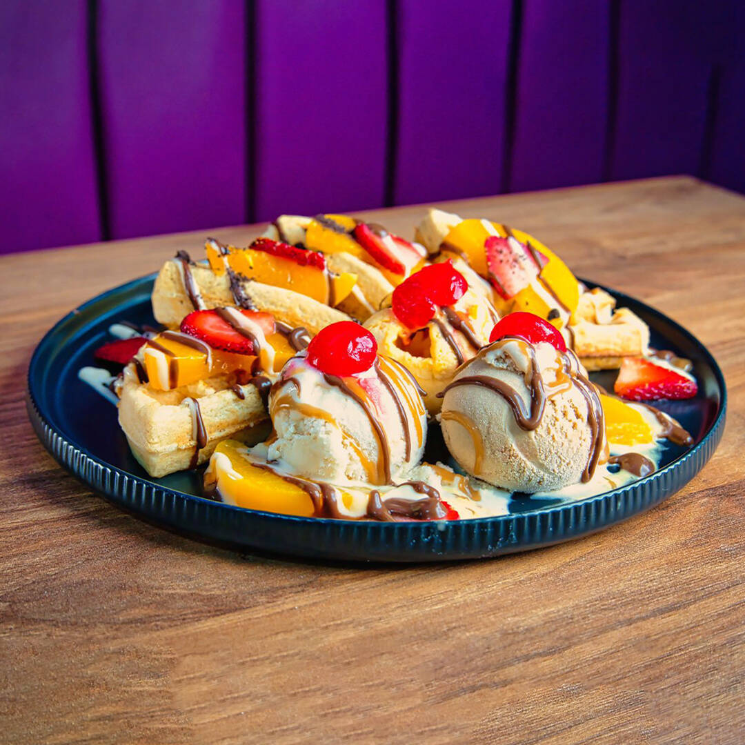 Papaya, mango, fresa, banano, queso, 2 sabores de helado, crema, salsas.