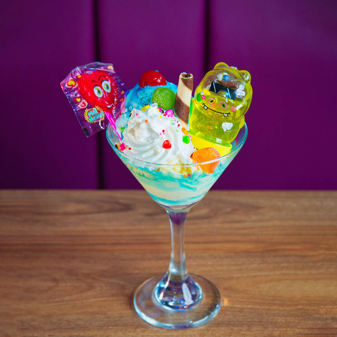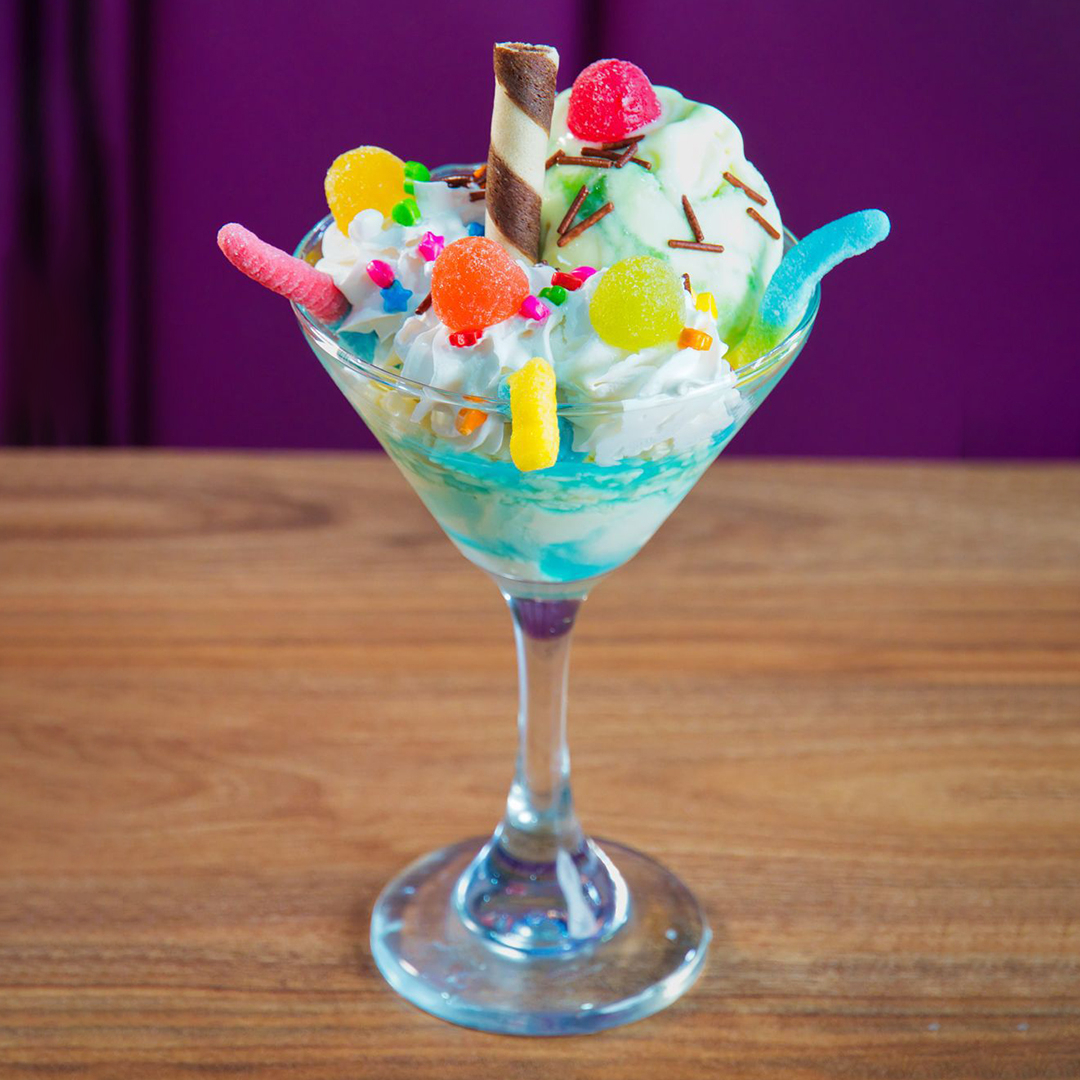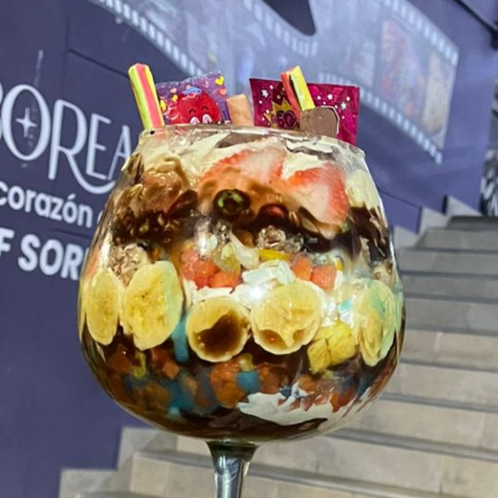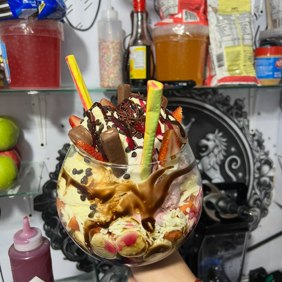 Crema, papaya, mango, manzana, banano, cereal, fresa, toppings dulces y ácidos, 4 bolas de helado, queso y salsas.