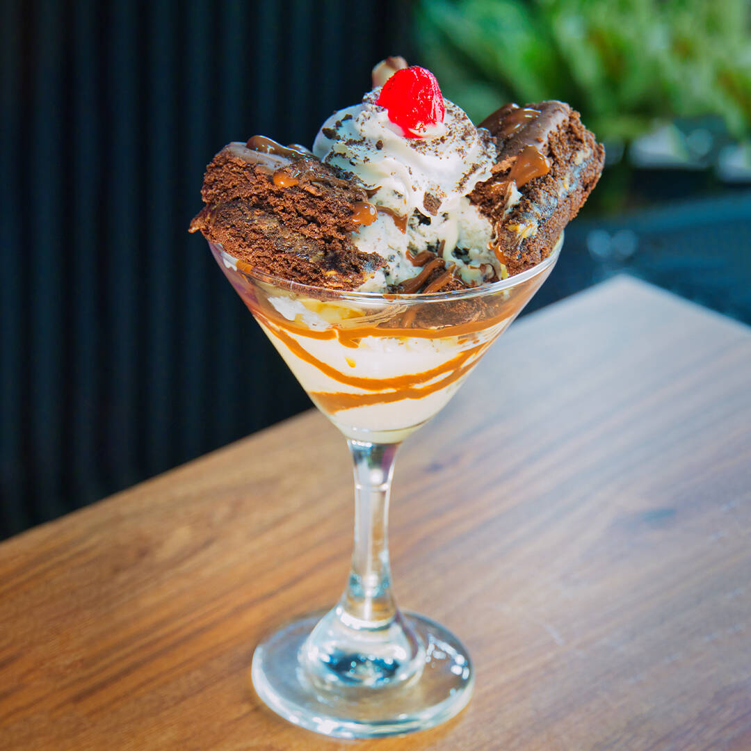 Helado de la casa acompañado de dos frutas, 2 toppings y salsas