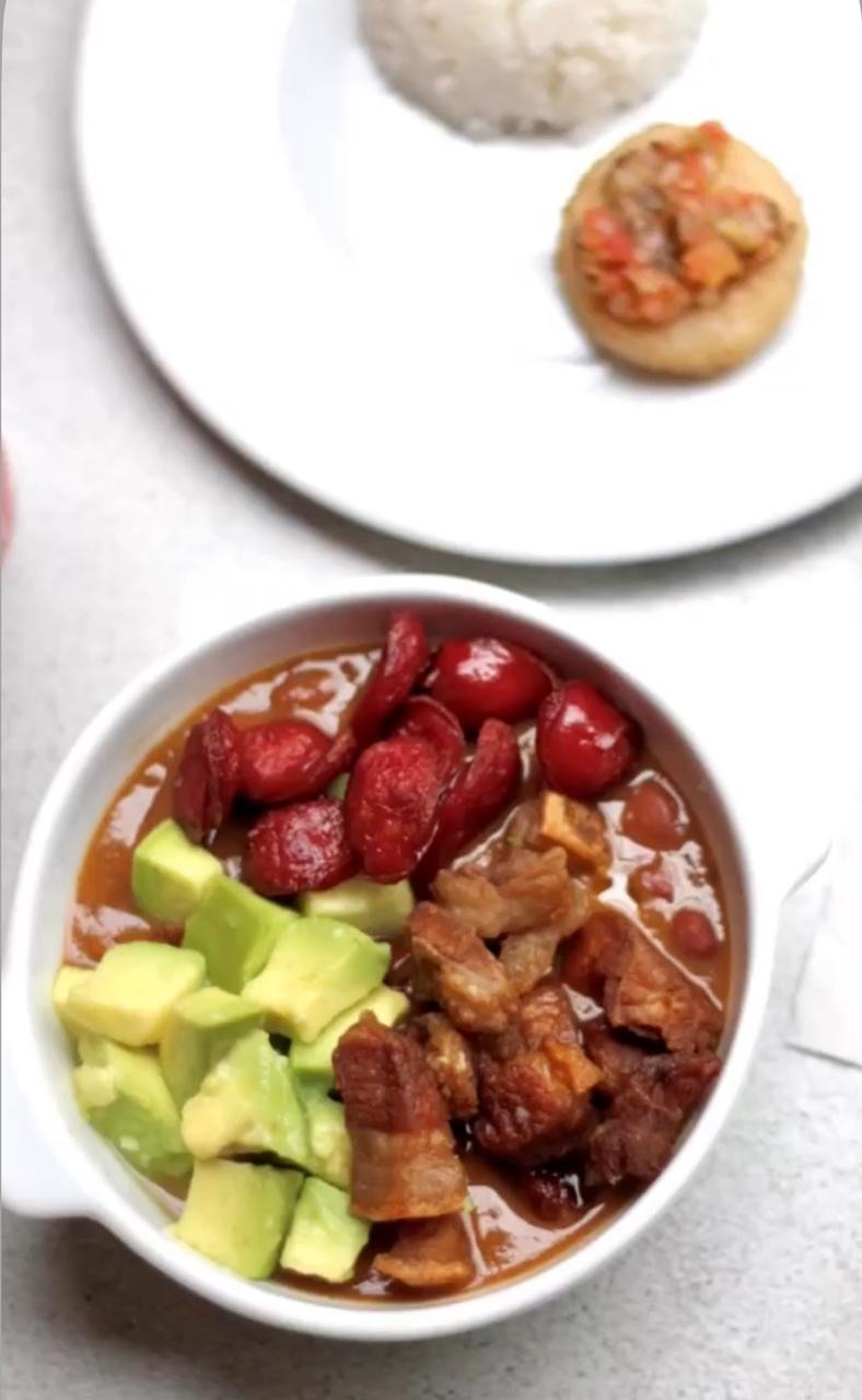 Cazuela a base de frijoles, arroz blanco, arepa con hogao, chicharrón, viruta de papa, hogao y platanito maduro (no incluye bebida)