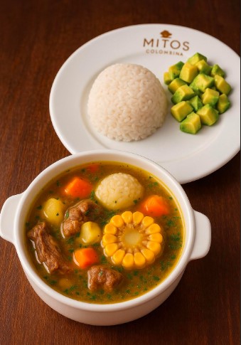 Cazuela a base de frijoles, arroz blanco, arepa con hogao, tres acompañamientos a eleccion y una limonada