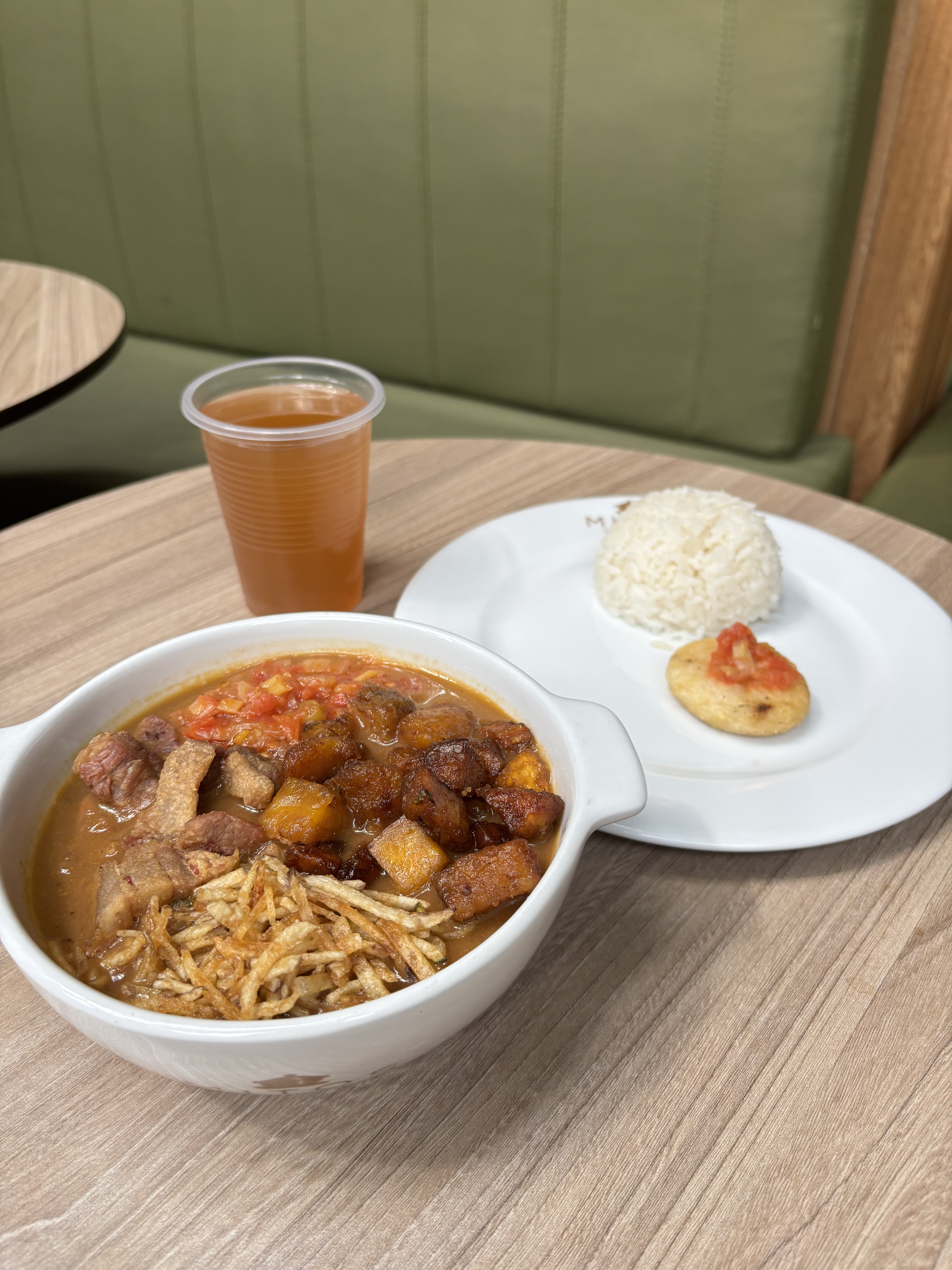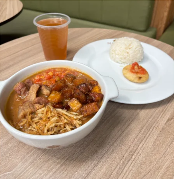 Cazuela a base de frijoles, arroz blanco, arepa con hogao, chicharrón, viruta de papa, hogao y platanito maduro (no incluye bebida)