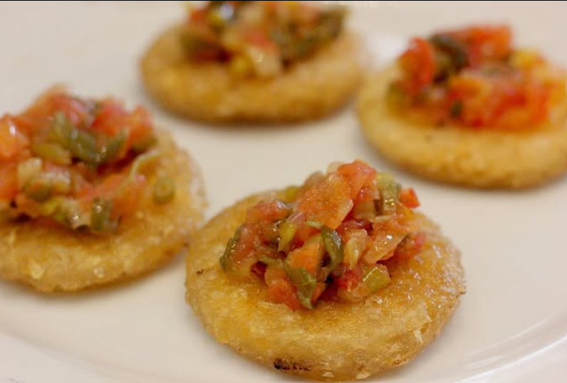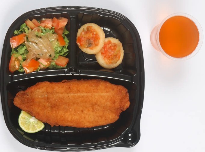 Filete de pescado apanado, acompañado de arepitas con hogao casero (x2), ensalada fresca de la casa con vinagreta y bebida tradicional de guandolo.