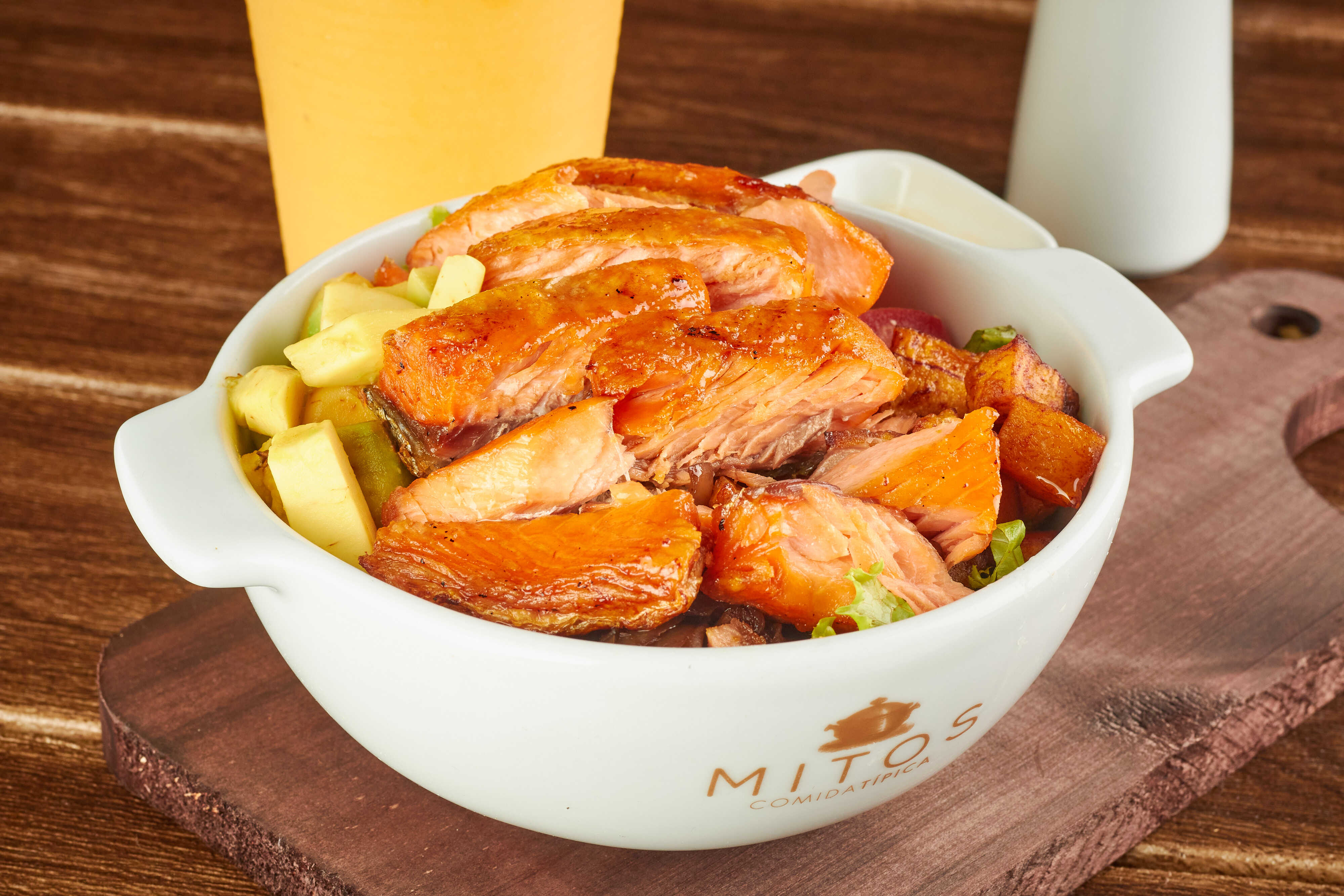 Bowl de Ensalada con Salmón contene Salmón 150grs, Lechuga, Tomate, Platano maduro, Aguacate, Cebolla caramelizada, Vinagreta