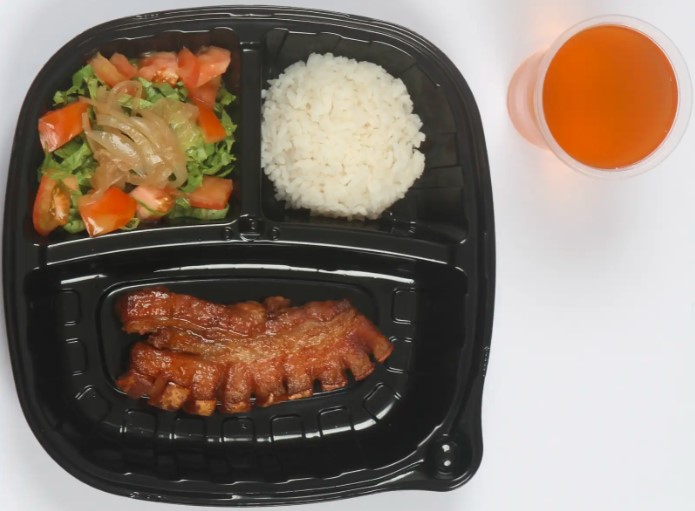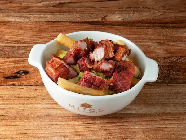 Chicharrón ahumado al punto crocante, acompañado de arroz blanco, ensalada fresca de la casa con vinagreta y bebida tradicional de guandolo.