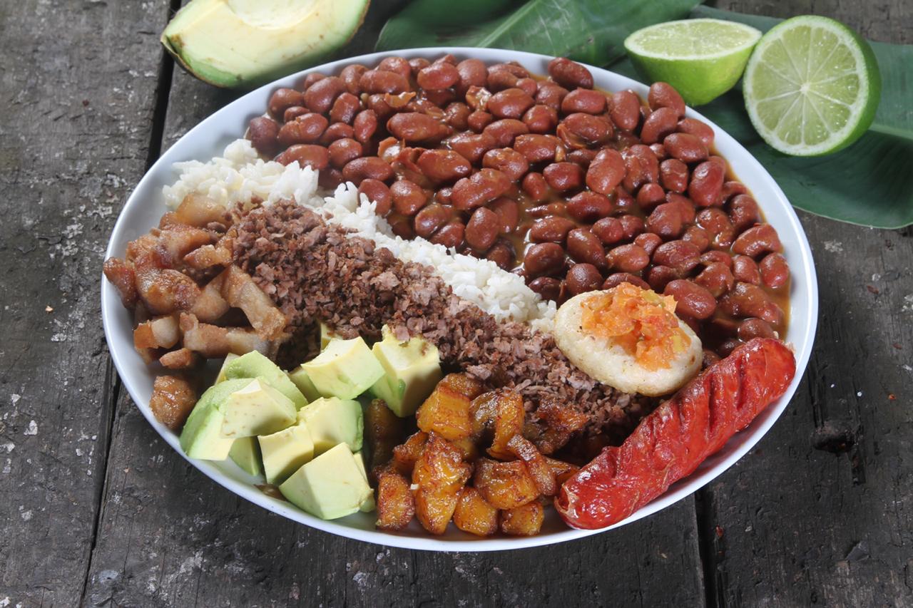 Frijoles, arroz blanco, arepa con hogao, chicharrón, chorizo, carne molida, maduro y aguacate