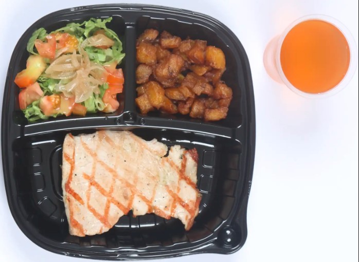 Pollo a la plancha o milanesa (apanado), acompañante Croqueta de yuca x2, ensalada de la casa con vinagreta y Bebida guandolo