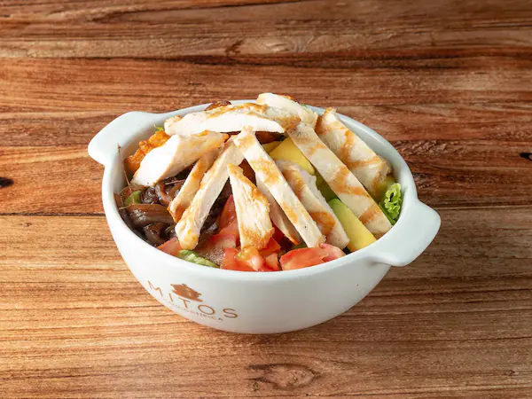 Lechuga, tomate, aguacate, cebolla caramelizada, trocitos de plátanos maduro, proteína a su elección.