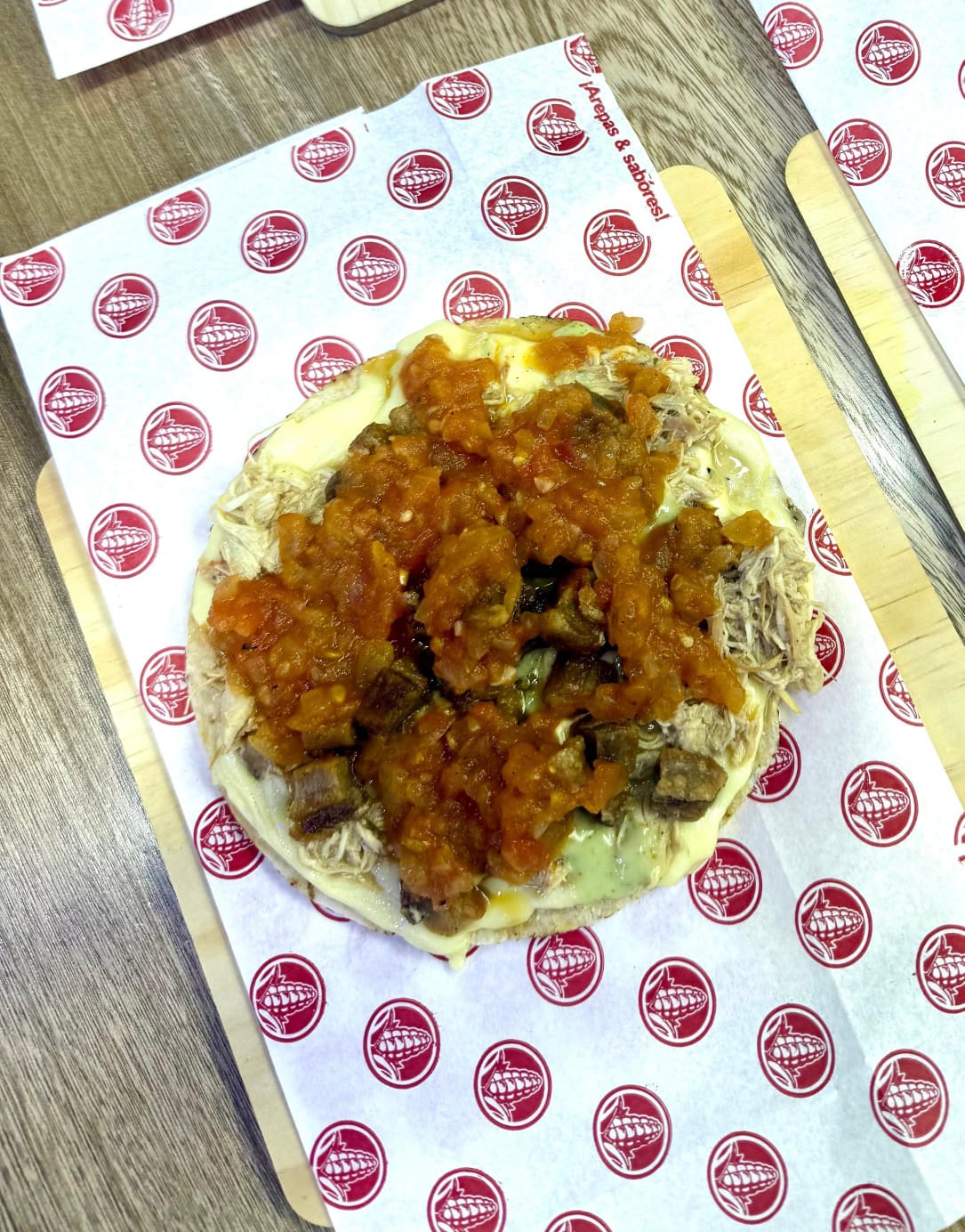 Chicharrón en trozos, posta de res mechada, queso mozzarella, hogao, maicitos y guacamole macerado.