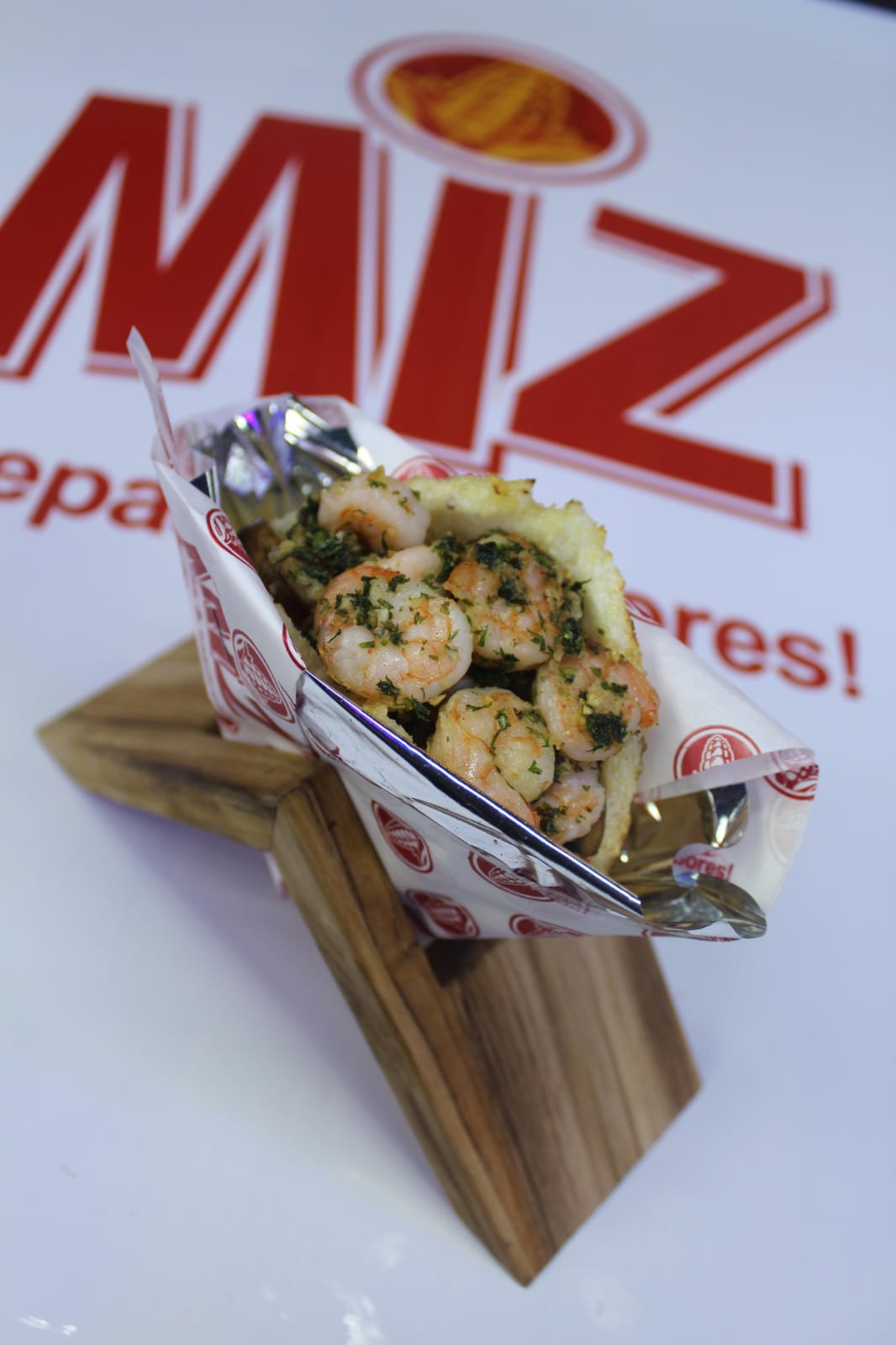 Camarones al ajillo, cerdo en fajas, queso mozzarella, champiñones, pico de gallo y pimentón.