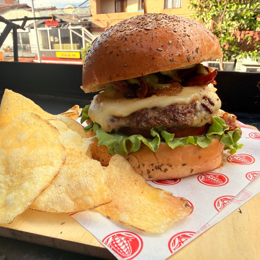 hamburguesa de res con papa chips,tocineta , cebolla caramelizada ,lechuga ,tomate y salsa de la casa