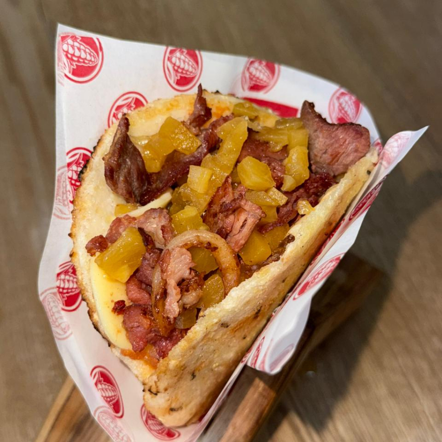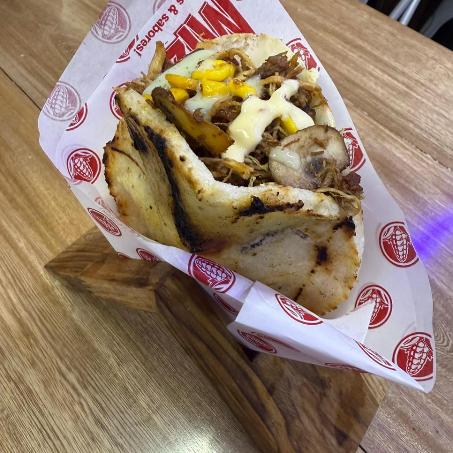 Solomo res en fajas, pollo mechado, tocineta, queso mozzarella, champiñones, guacamole y maicitos.
