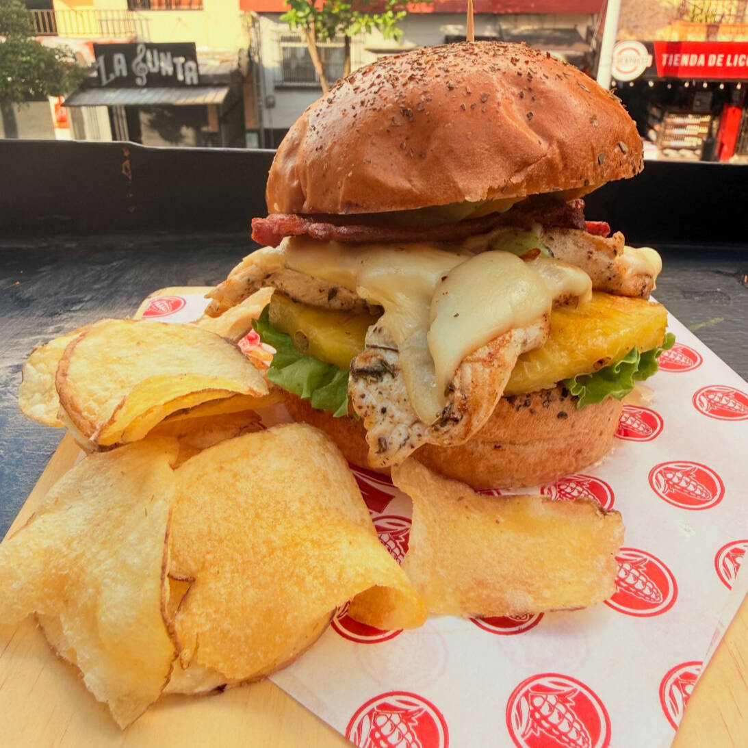 hamburguesa de pollo con papa chips , tocineta , piña , lechuga , tomate . y salsas de la casa