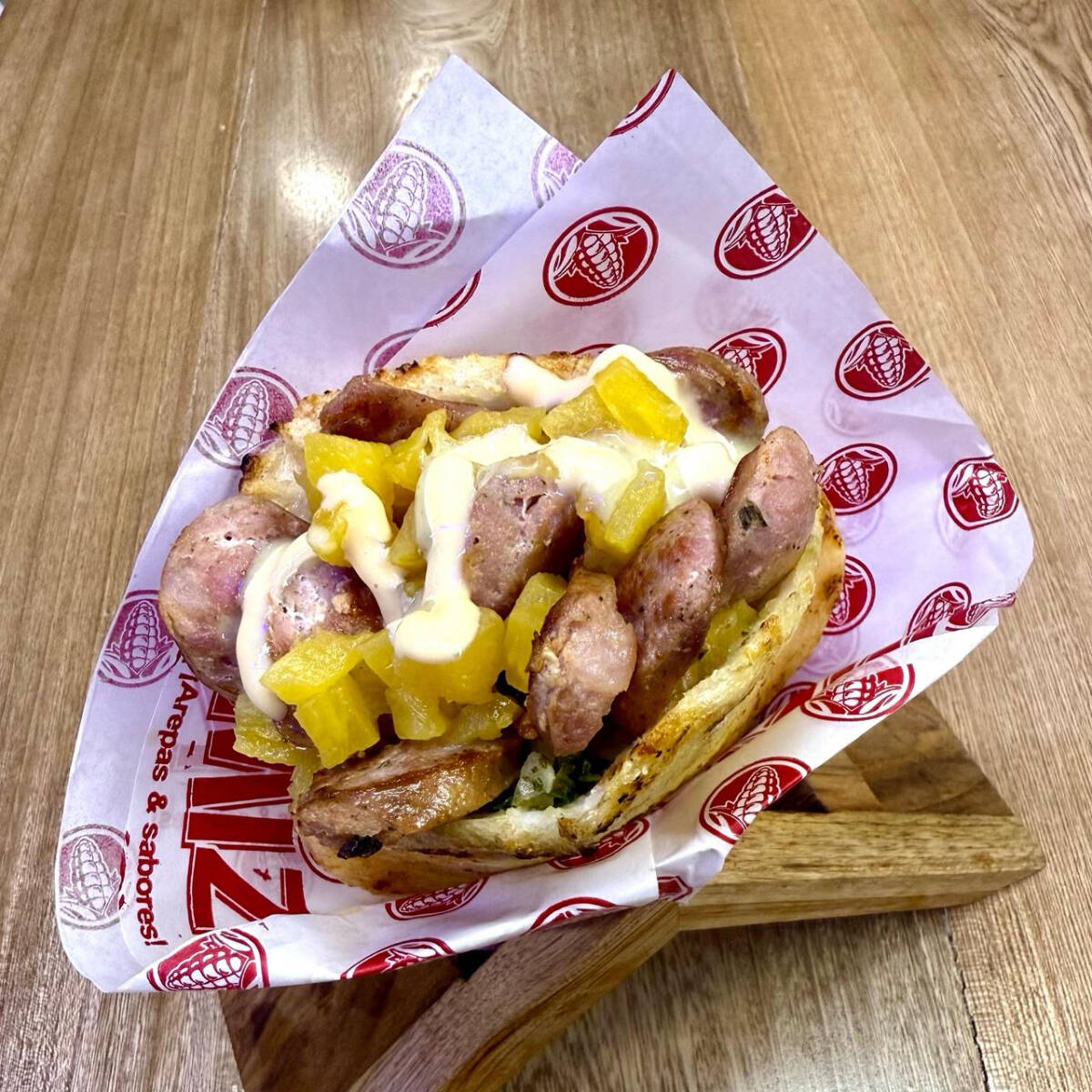 Chorizo argentino, solomo de res en fajas, queso mozzarella, chimichurri y piña.
