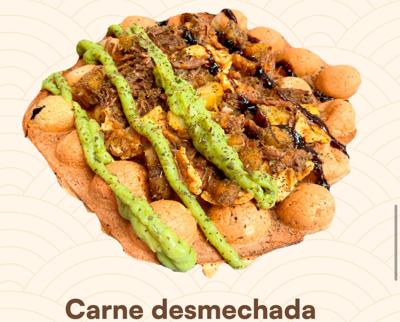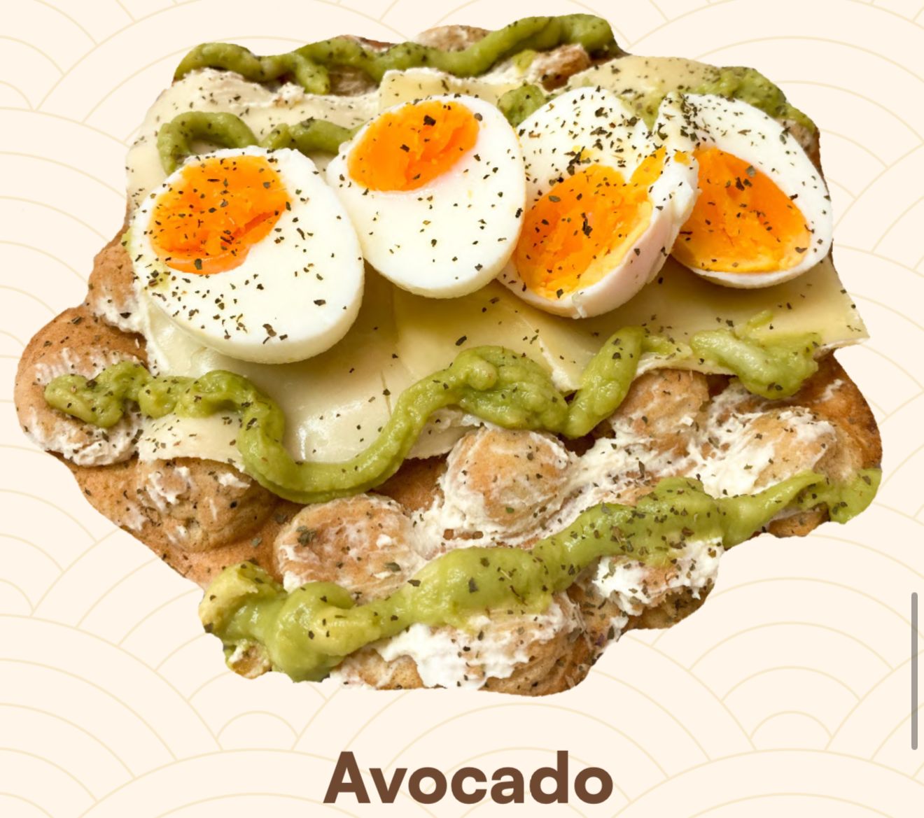 Hong Kong waffle con huevos, queso crema, queso mozarella y guacamole