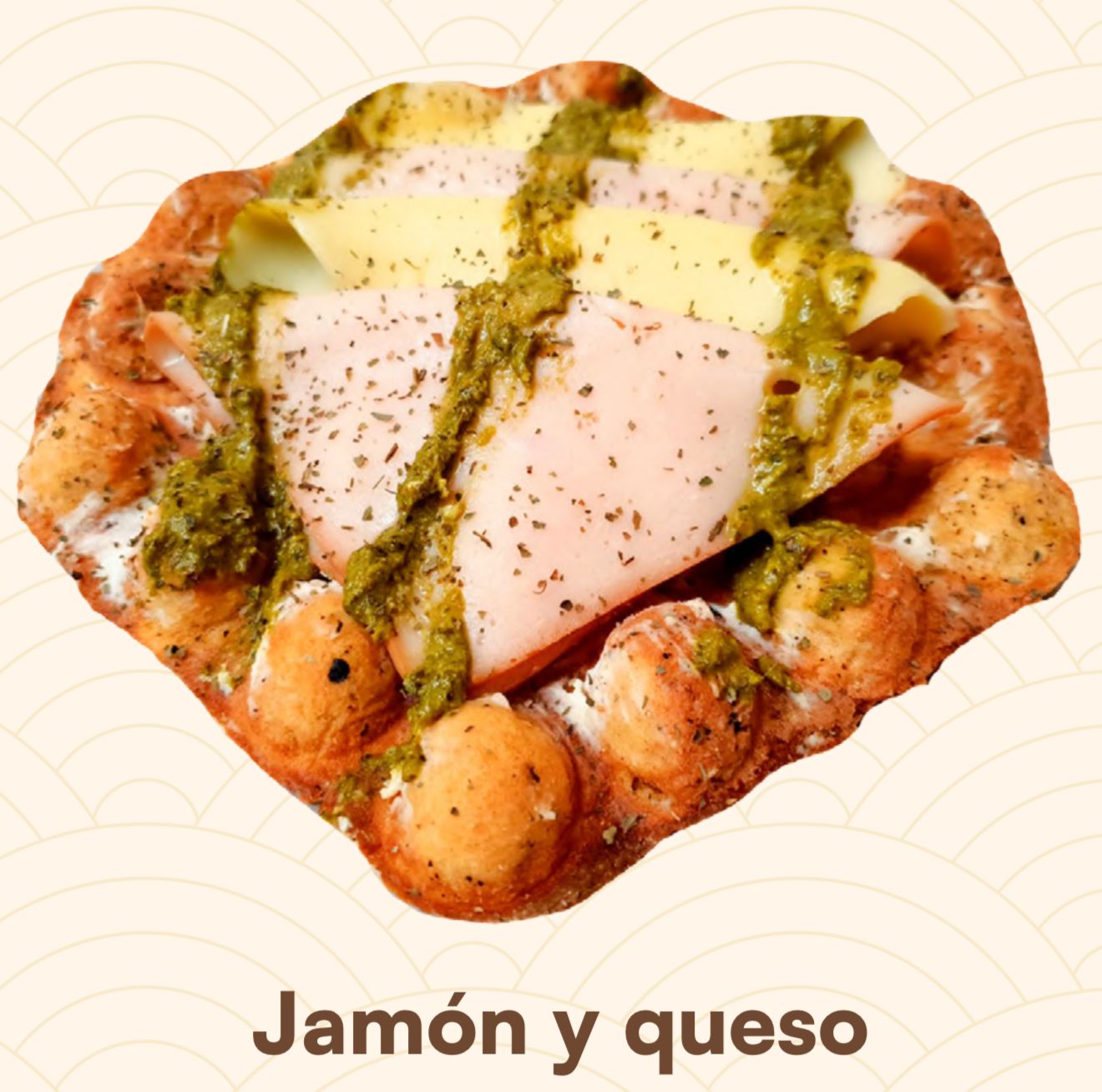 Hong Kong Waffle con jamón, queso mozarella, pesto y queso crema.