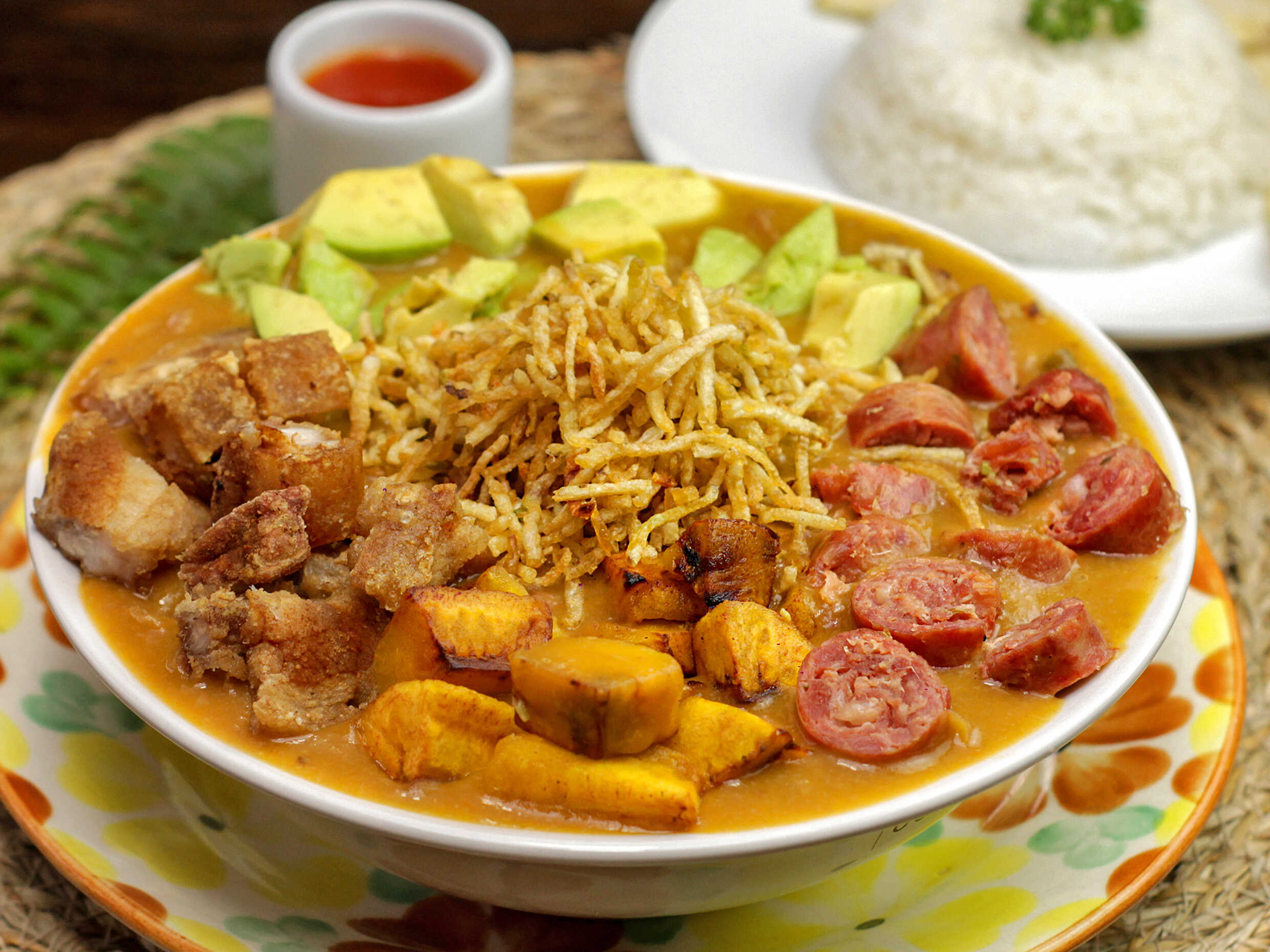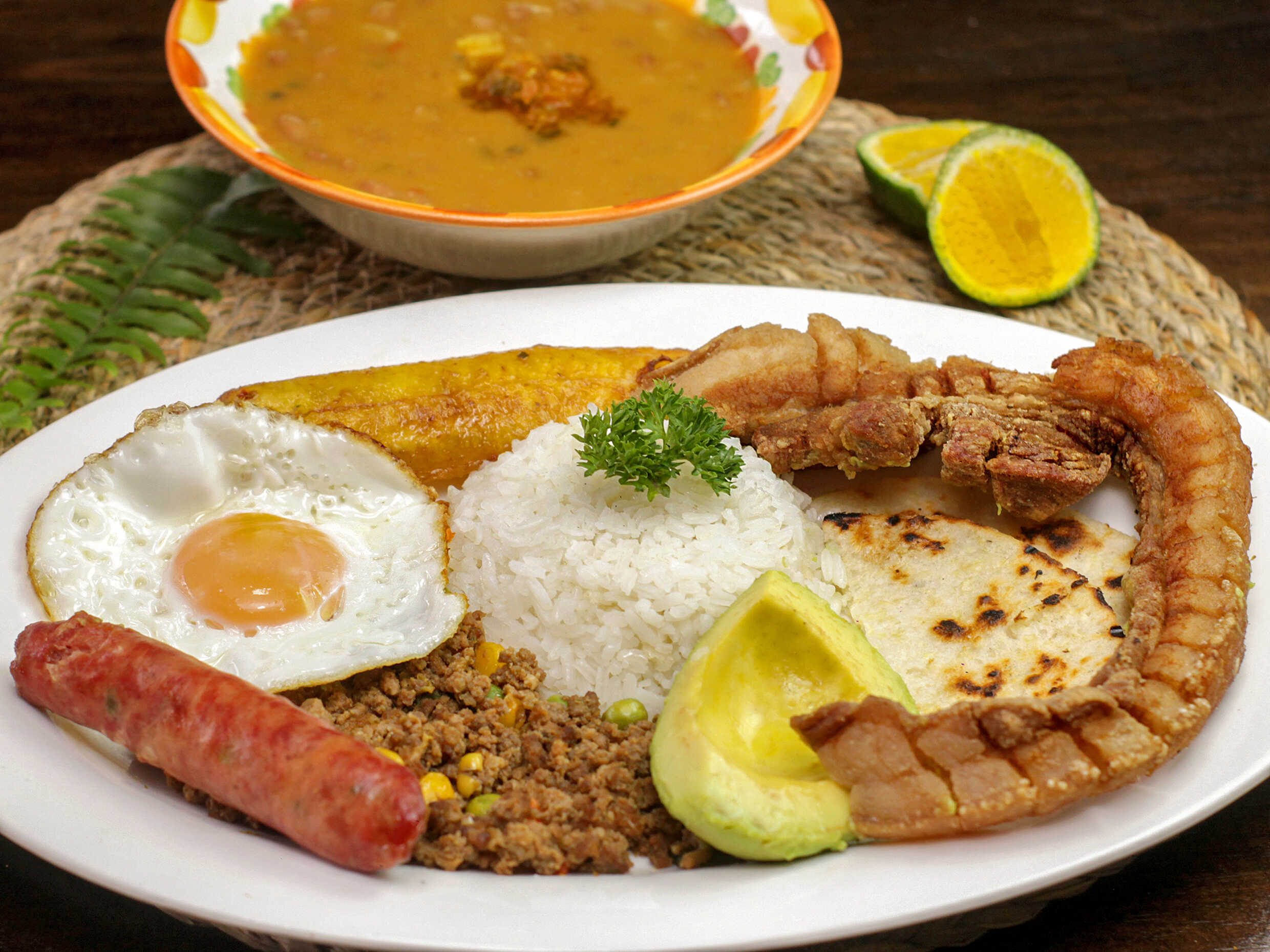 Frijol, chicharrón picado, chorizo, maduritos, ripio de papa, aguacate, acompañada de arroz y arepa.