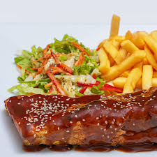Costillas de cerdo bañadas en salsa BBQ, acompañadas de papas a la francesa, arepa con queso y ensalada