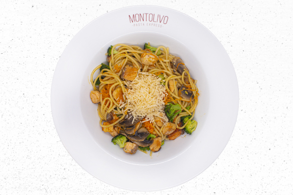 Pasta con salsa de maní cremosa, brócoli, tomate cherry, champiñones, semillas de girasol, ajo y albahaca.