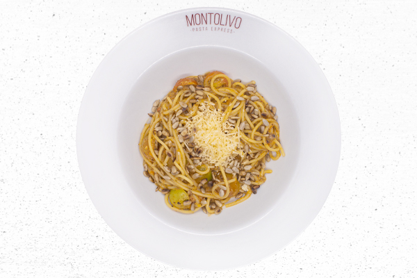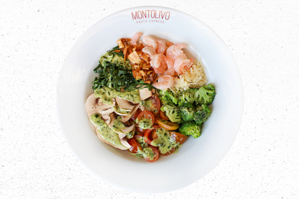 Pasta con salsa de maní cremosa, brócoli, tomate cherry, champiñones, semillas de girasol, ajo y albahaca.