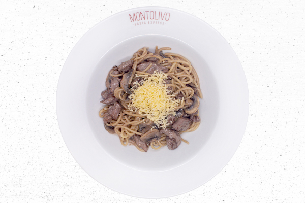 Salsa alfredo con trozos de solomo y champiñones cocinados en vino tinto.