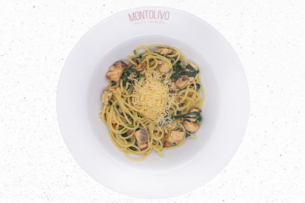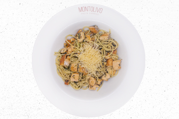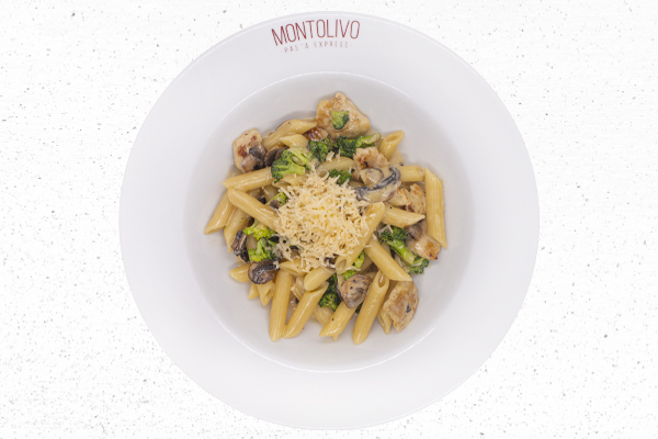 Salsa alfredo con trozos de pollo, champiñones y brócoli.