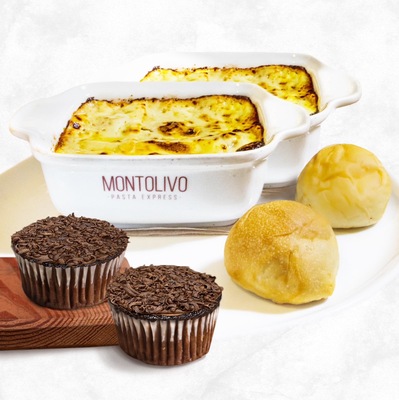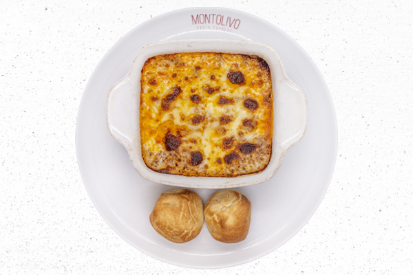 Lasagna de pollo, bolognesa y salsa napolitana, crema de leche y queso mozzarella.