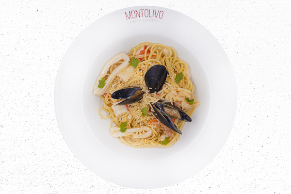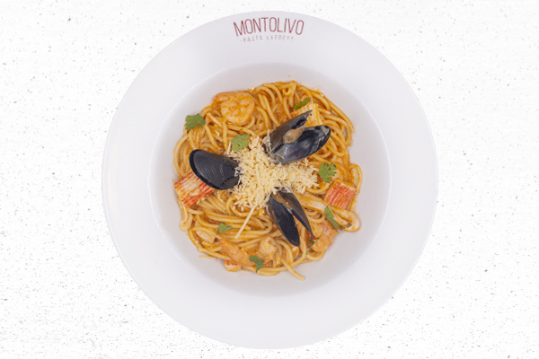 Salsa napolitana con salsa alfredo, ajo, cilantro, camarones, calamares, mejillones y palmitos de cangrejo.