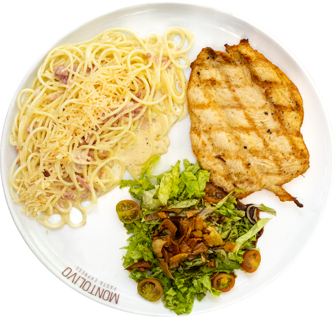Arma tu plato con pollo más pasta carbonara (pasta larga) con ensalada de la casa.
