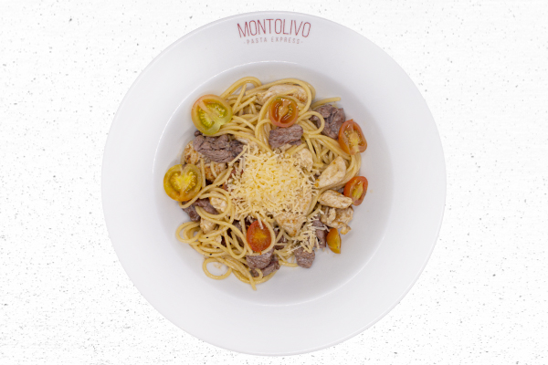 Salsa al burro con trozos de solomo, pollo y tomate cherry.