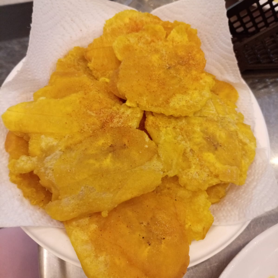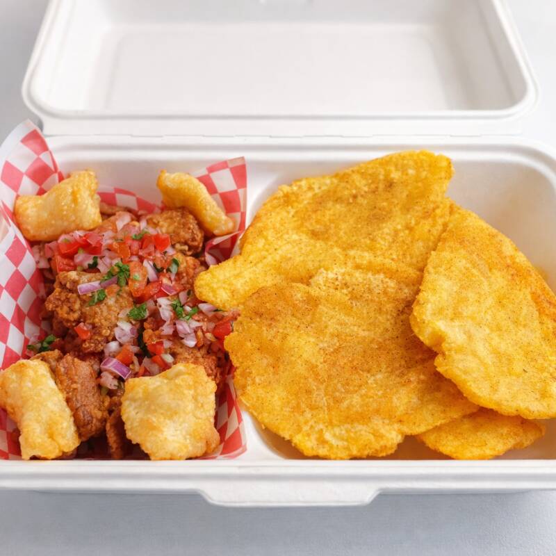 5 patacones, 110g de chicharrón, verduras bañadas en pimienta y limón, salsa.