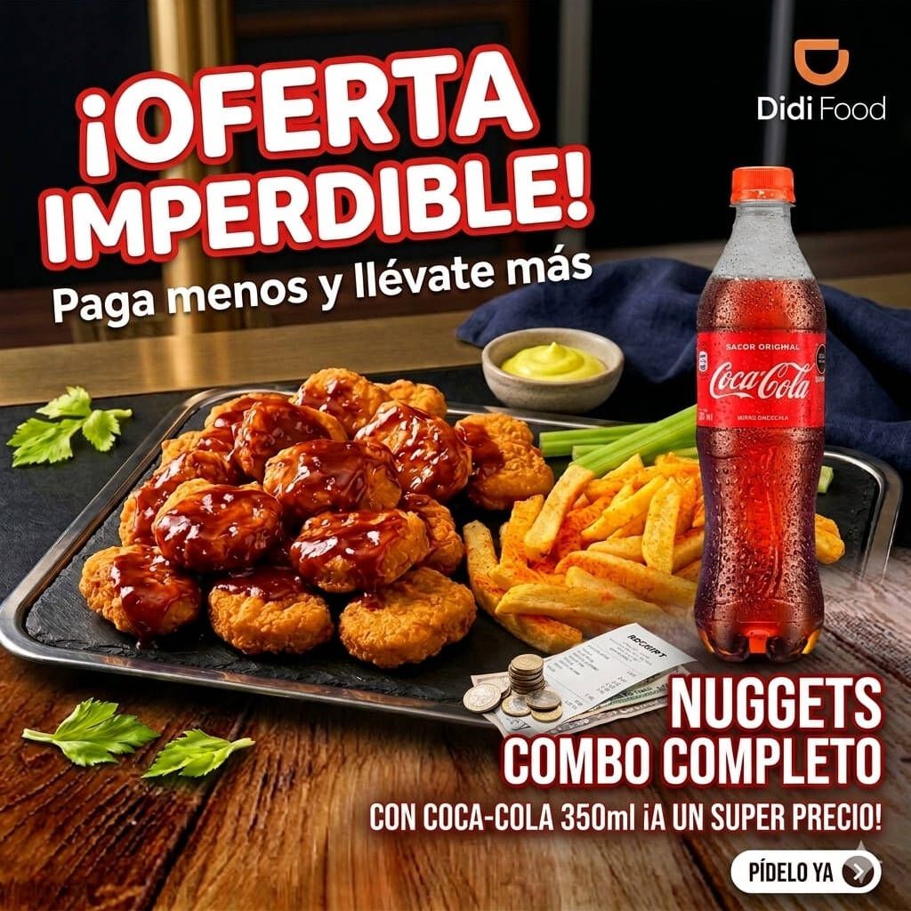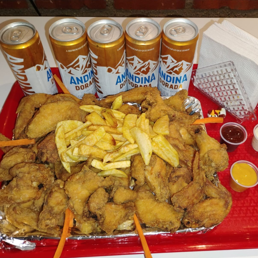 5 unidades de pollo, 180g papas (casco o francesa), 1 salsa (Bañadas o salsa aparte), 1 aderezo, 1 Gaseosa mini (coca cola - manzana - colombiana?