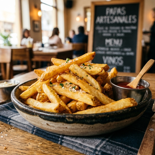 200g papas (casco o francesa), 2 salsa (Bañadas o salsa aparte), 1 aderezo.