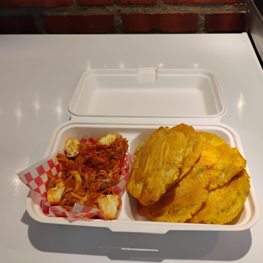 5 patacones, 110g de res desmechado, queso, fusión de verduras y especias, salsa.