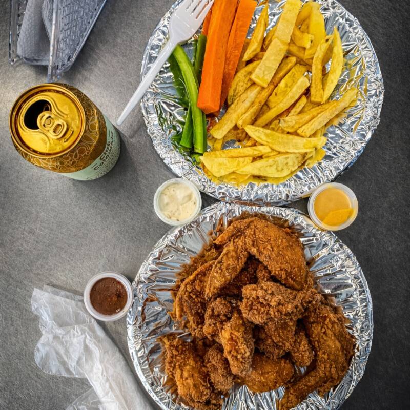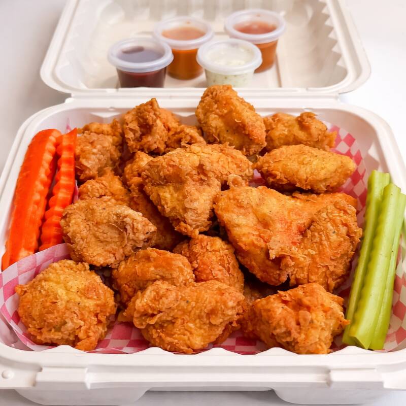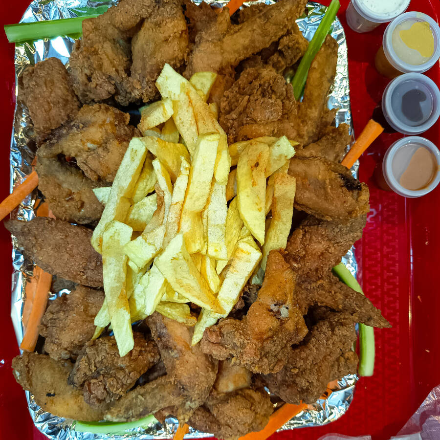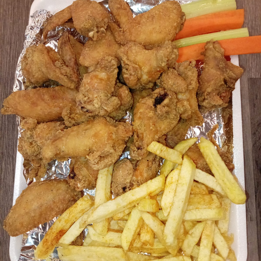 20 unidades de pollo, 300g papas (casco o francesa), 3 salsa (Bañadas o salsa aparte), 2 aderezo.