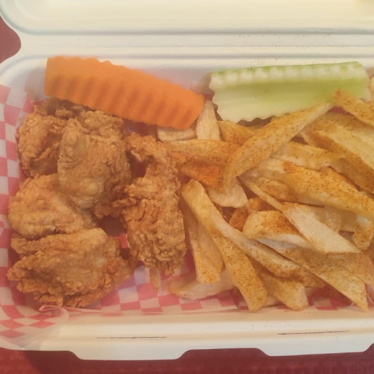 10 unidades de pollo, 230 g papas (casco o francesa), 2 salsa (Bañadas o salsa aparte), 1 aderezo.