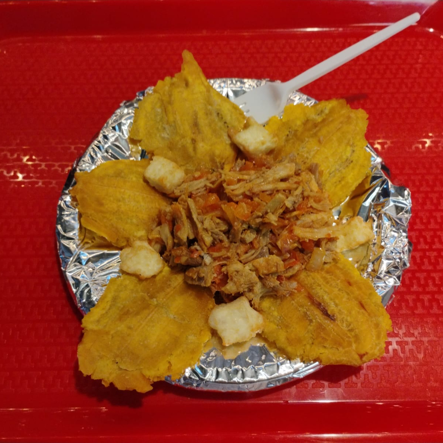 5 patacones, 110g de cerdo desmechado, queso, fusión de verduras y especias, salsa.