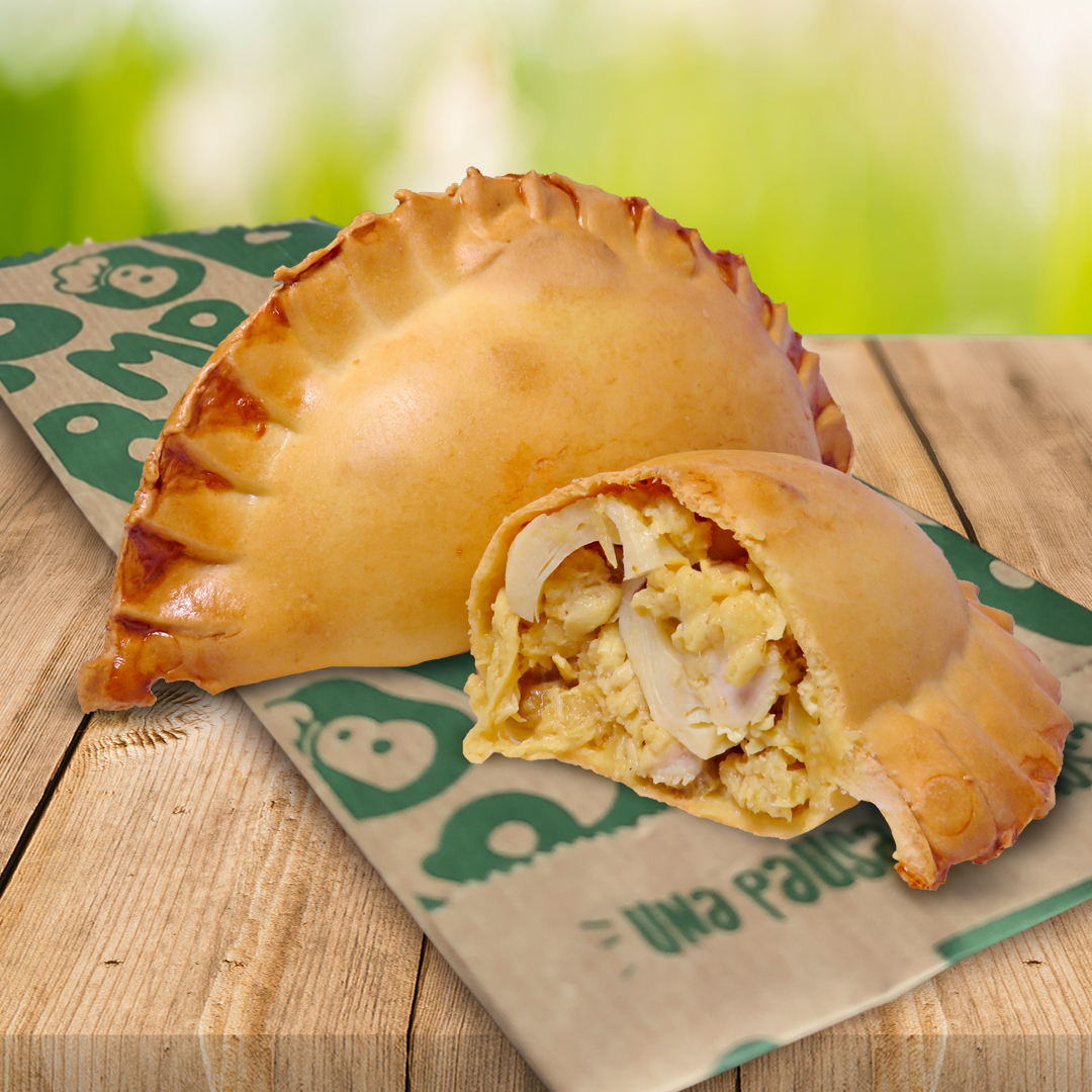 Deliciosa empanada horneada rellena de pollo, trocitos de huevo y aceituna.